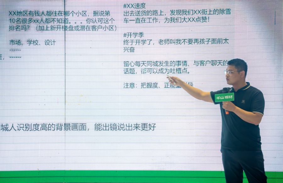 千山板材大區(qū)經(jīng)理王殿忠致辭。王經(jīng)理分享到,行業(yè)競(jìng)爭(zhēng)壓力存在的同時(shí)也涌現(xiàn)出了機(jī)遇,千山將與伙伴們一起抓住機(jī)遇,形成事業(yè)共同體,多維度進(jìn)擊,多渠道拓展,最終轉(zhuǎn)化為效益增長(zhǎng)。