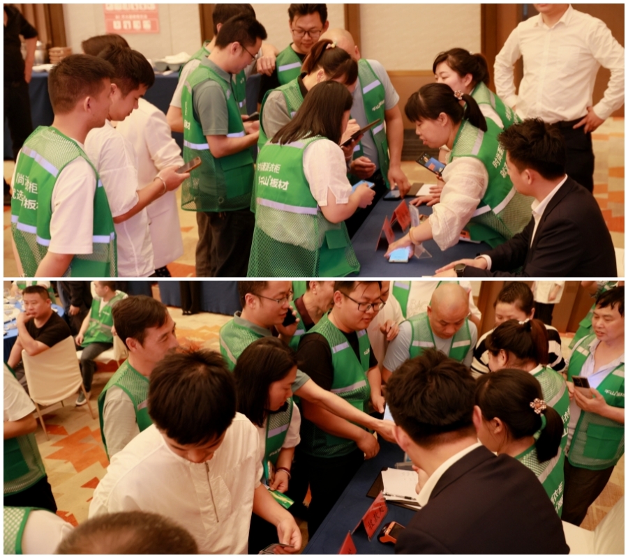 簽到結(jié)束后,大家仔細(xì)參觀了千山板材展示區(qū)的全品類產(chǎn)品,包括四大品類板材、新款樣冊、門墻柜一體化產(chǎn)品、配套輔材等。大家相互交流,分享產(chǎn)品應(yīng)用心得。