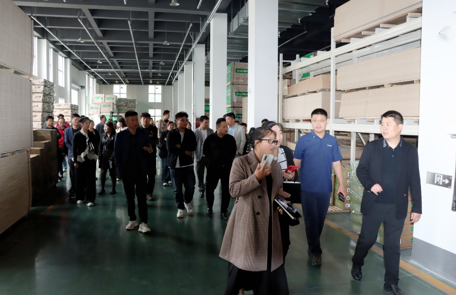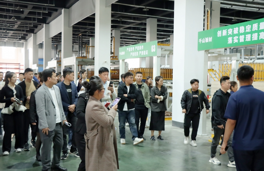 學(xué)習(xí)會結(jié)束后,王殿忠經(jīng)理帶領(lǐng)大家參觀了千山的現(xiàn)代化生產(chǎn)工廠,從板材品類、生產(chǎn)工序、檢驗(yàn)出廠等方面深入了解板材生產(chǎn)環(huán)節(jié)。
