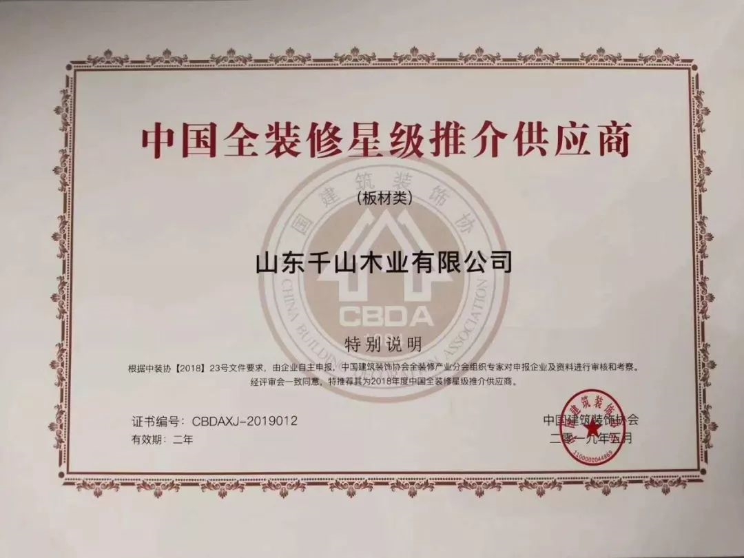 2019年5月,千山憑借高質量的產(chǎn)品、良好的信譽成功入圍由中國建筑裝飾協(xié)會主辦的2018年度《全裝修供應商推介目錄》企業(yè)名單及《全裝修星級供應商推介目錄》。