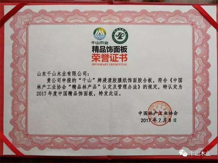 2017年7月,中國木質林產(chǎn)品質量提升與品牌建設高峰論壇在廣州舉行,千山應邀參加,并榮獲2017年度“精品人造板(含飾面板)”、“精品裝飾紙”榮譽。