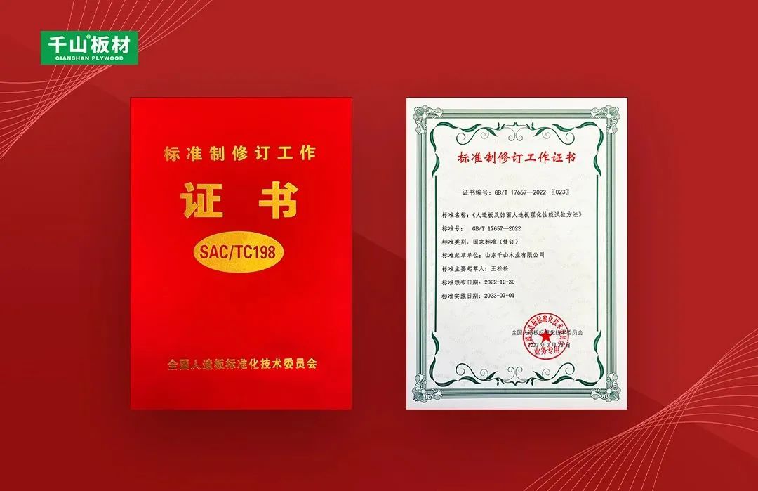 2023年3月,由全國人造板標準化技術委員會、中國林業(yè)科學研究院木材工業(yè)研究所、林業(yè)產(chǎn)業(yè)標準化國家創(chuàng)新聯(lián)盟主辦的《人造板及飾面人造板理化性能試驗方法》等新頒布標準宣貫培訓暨產(chǎn)業(yè)發(fā)展研討會在浙江南潯召開,千山應邀出席并獲頒國家標準制修訂工作證書。