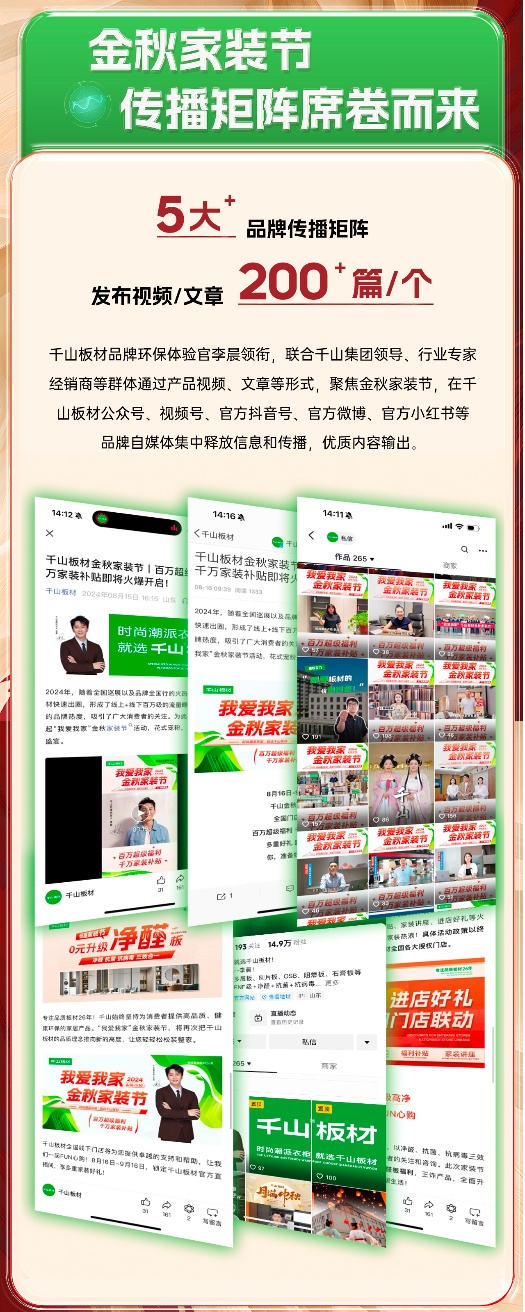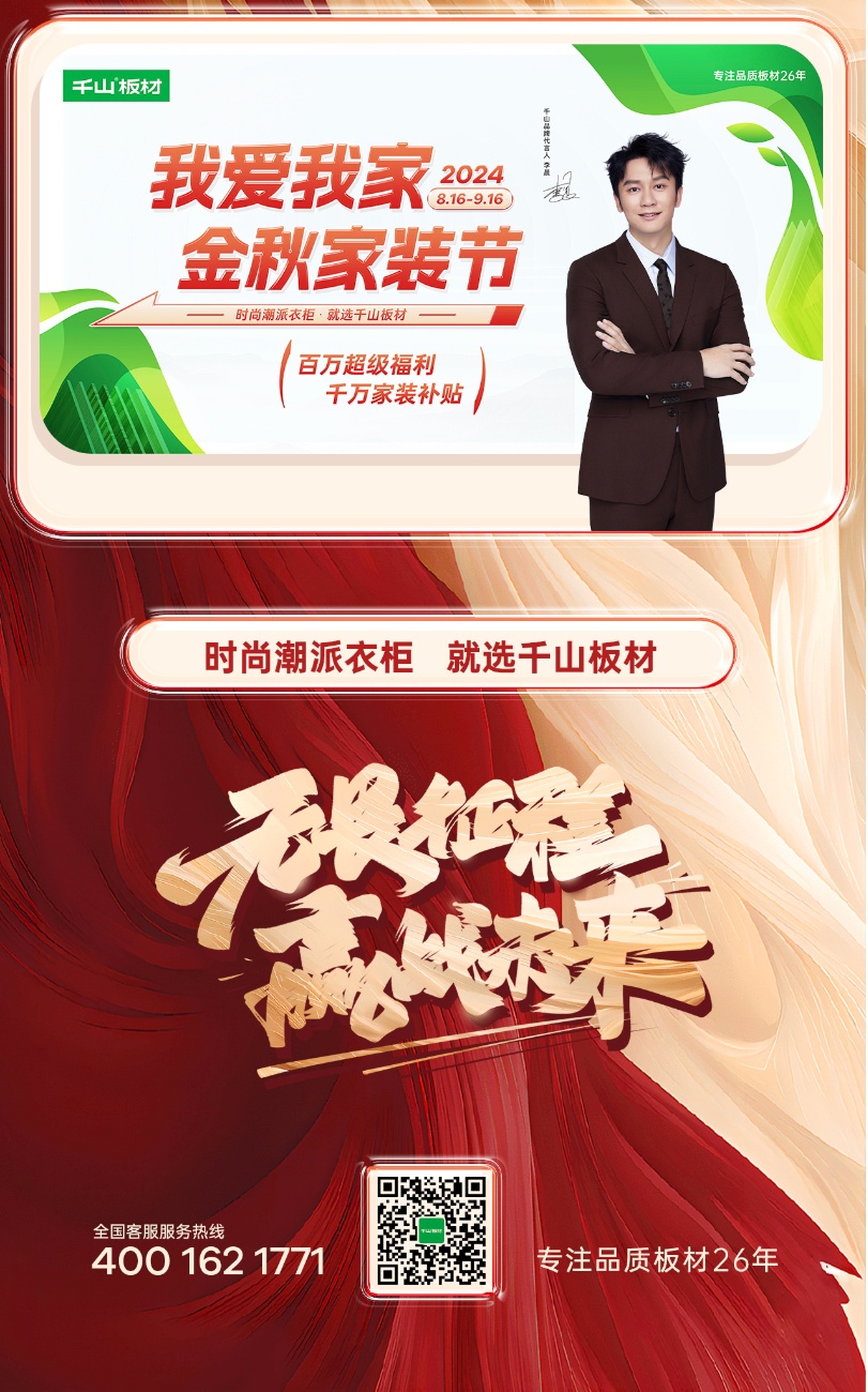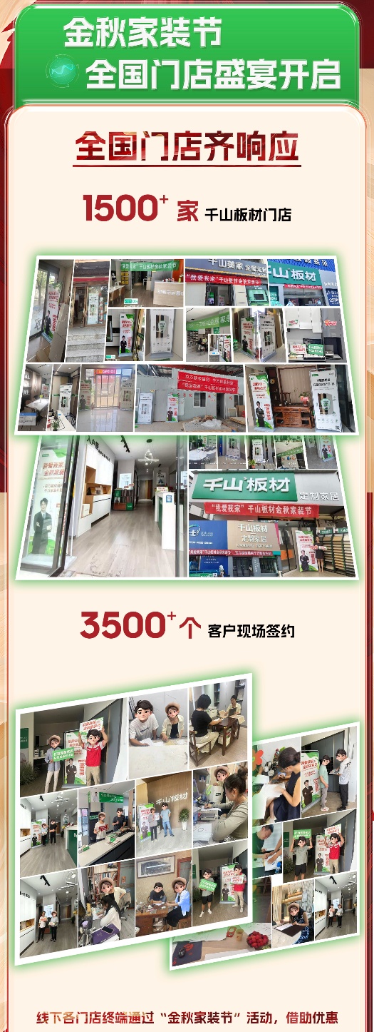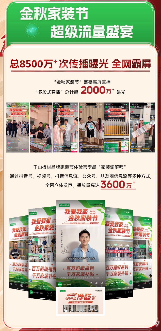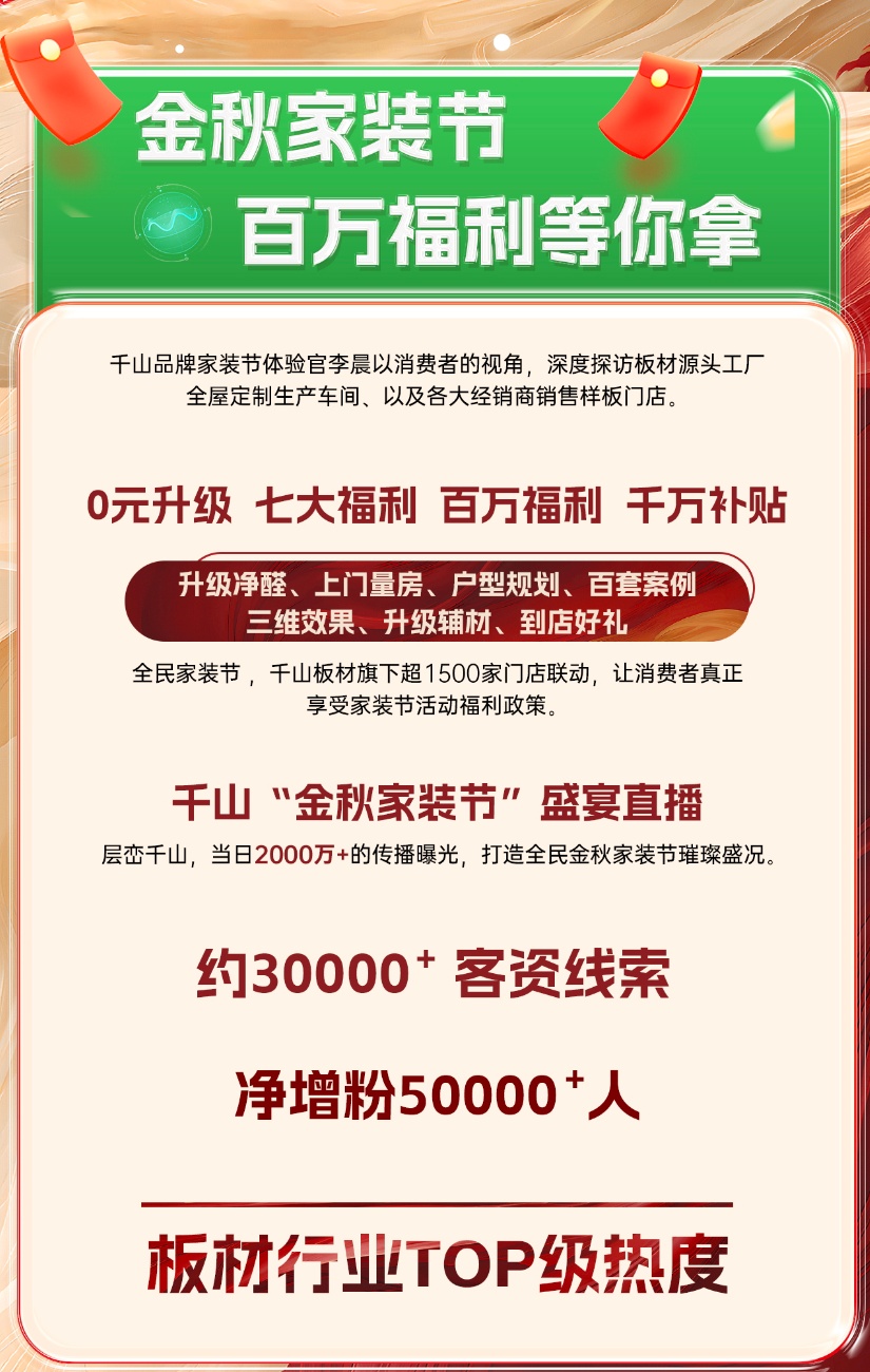 8月16日,千山金秋家裝節(jié)火爆上線,截至9月16日,為期30天的家裝節(jié)活動日前正式落下帷幕?;顒悠陂g,千山板材全國1500+門店聯(lián)動,全網(wǎng)曝光量超8500萬、線上直播觀看量超2000萬、簽約數(shù)量達3500+,實現(xiàn)了品牌聲量和銷售業(yè)績的雙豐收!
