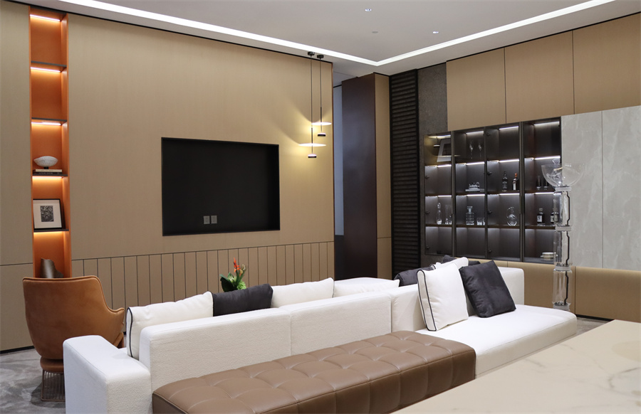 新中式與侘寂風(fēng)相結(jié)合,保留中式的獨(dú)特韻味。展示柜2109淺棕×故宮紅,增加了視覺上的深度和質(zhì)感。電視墻采用淺色石材紋理面板×夢幻敦煌,增添穩(wěn)重質(zhì)感。