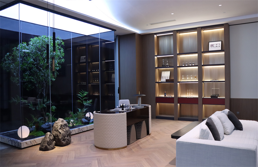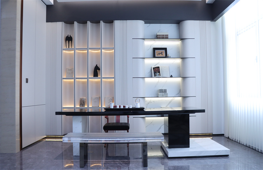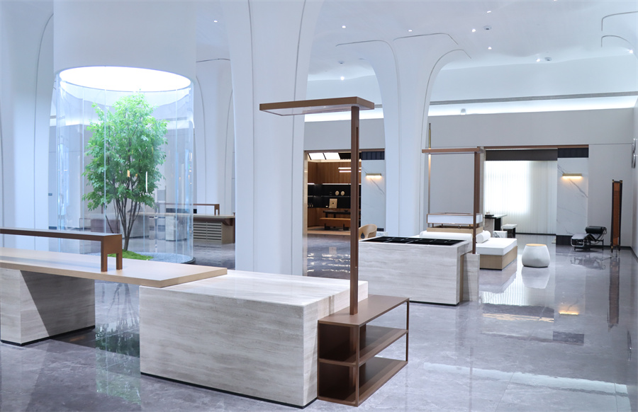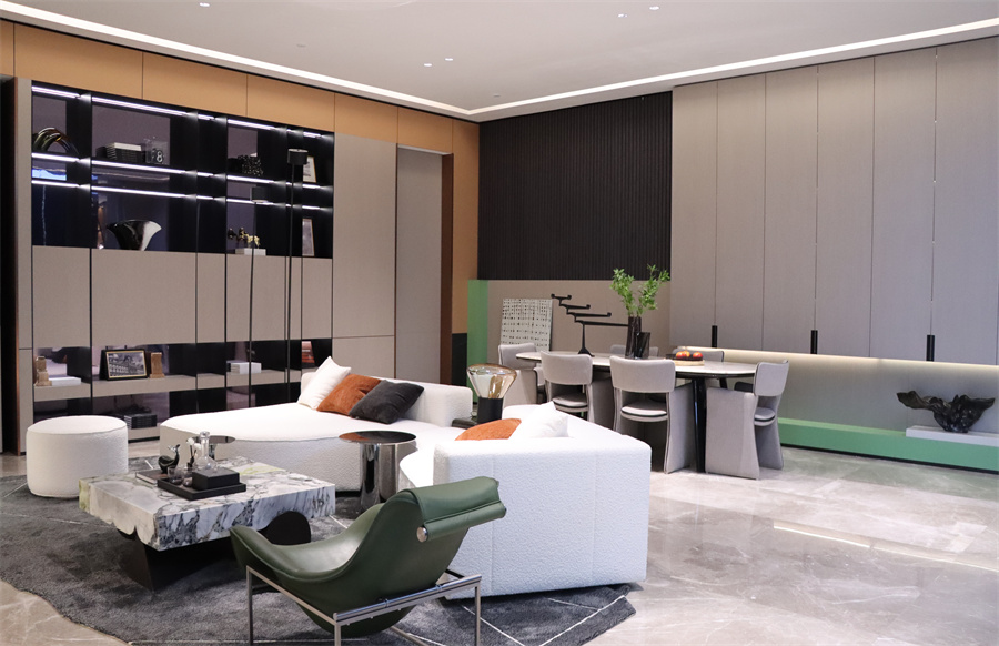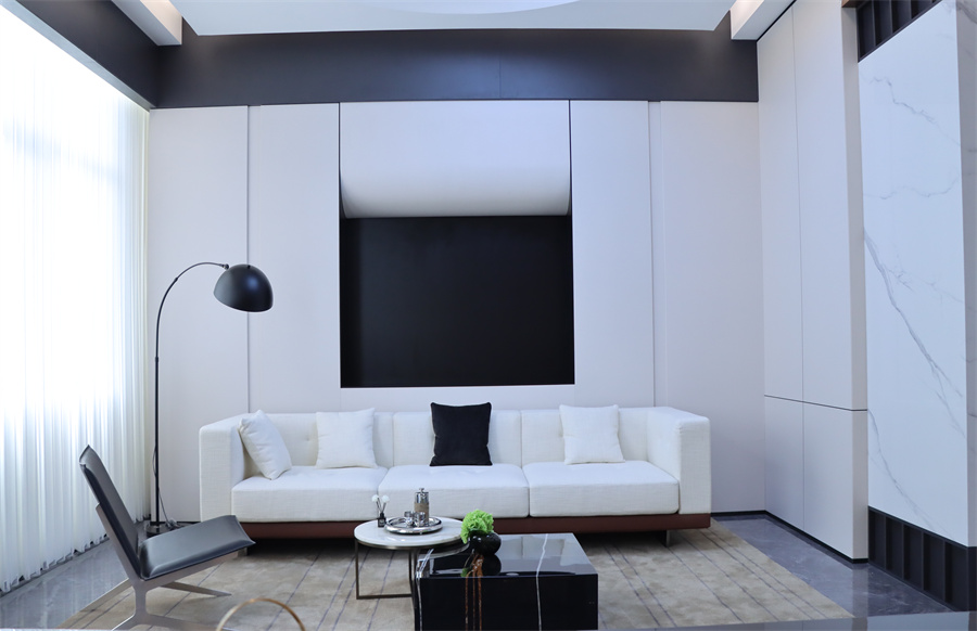 展廳五大空間呈現(xiàn)現(xiàn)代極簡、現(xiàn)代輕奢、新中式三大主流家裝風(fēng)格,采用千山板材四大品類,糅合六大系列花色:木紋系列、純色系列、石紋系列、同步系列、數(shù)碼系列、PET系列,演繹多元化生活場景。