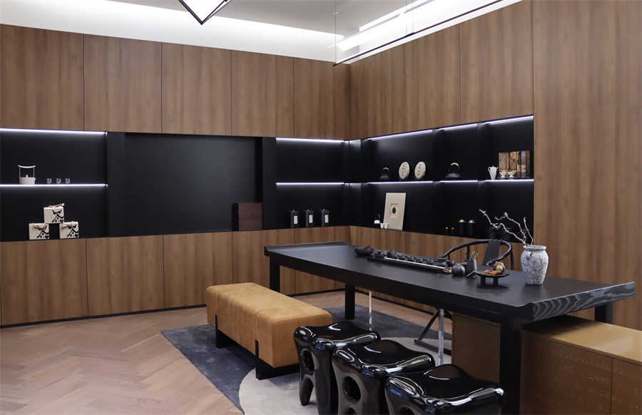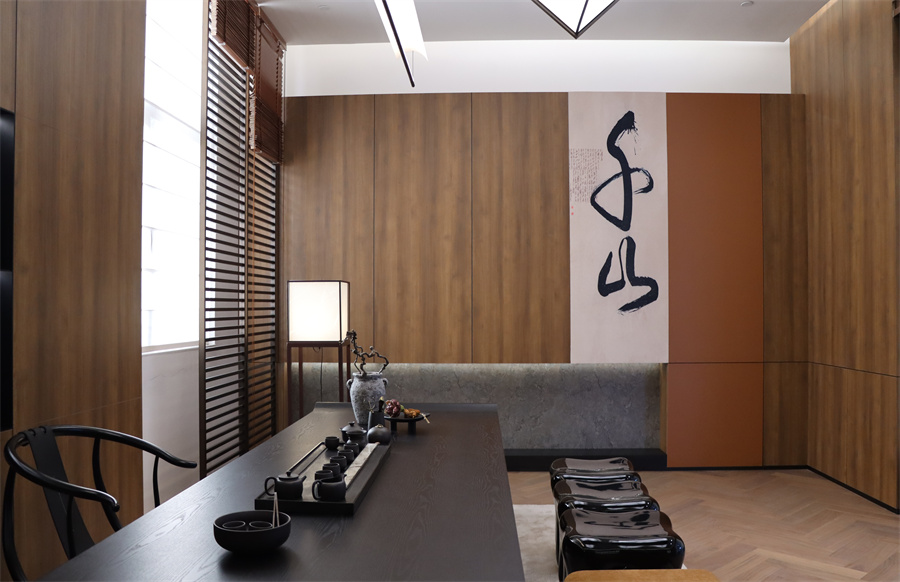 新中式風(fēng)格茶室主體配色為門墻柜一體花色金色胡桃,其獨(dú)特木質(zhì)紋理營造出自然質(zhì)樸之韻,與木質(zhì)護(hù)墻板與地板遙相呼應(yīng),兼具耐用性和溫暖質(zhì)感。