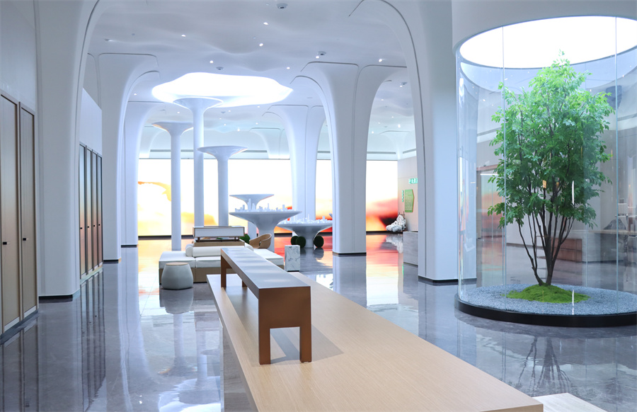 1500㎡現(xiàn)代美學(xué)空間,主中心以“生命之樹”為設(shè)計(jì)理念,營造自然與人文交融的場景化空間。吊頂以綿延的山脈形態(tài)表達(dá)千山砥礪深耕的工匠精神,樹冠形態(tài)的立柱寓意生命之樹的自然生長和璀璨綻放。