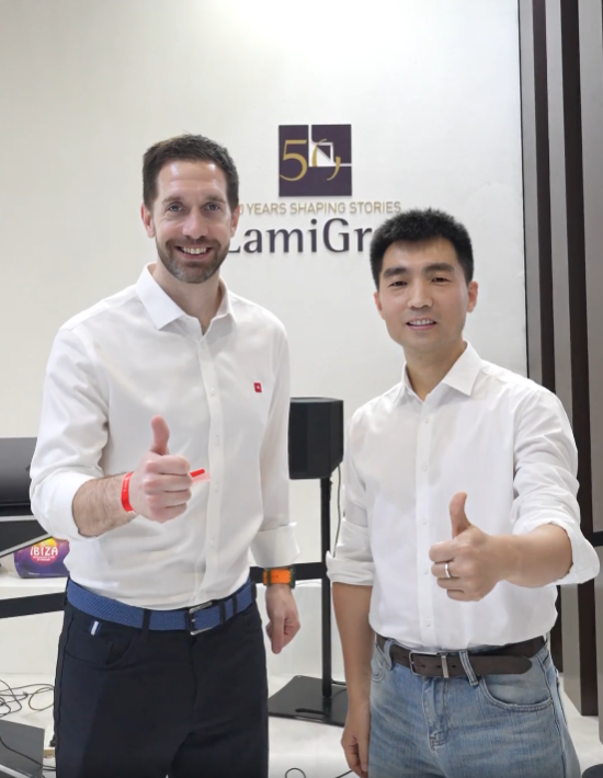 如果說(shuō)德國(guó)工藝賦予千山板材以“骨血”,那么歐洲設(shè)計(jì)則為其注入了“靈魂”。在西班牙拉米展位,王總與拉米負(fù)責(zé)人進(jìn)行深入交流。