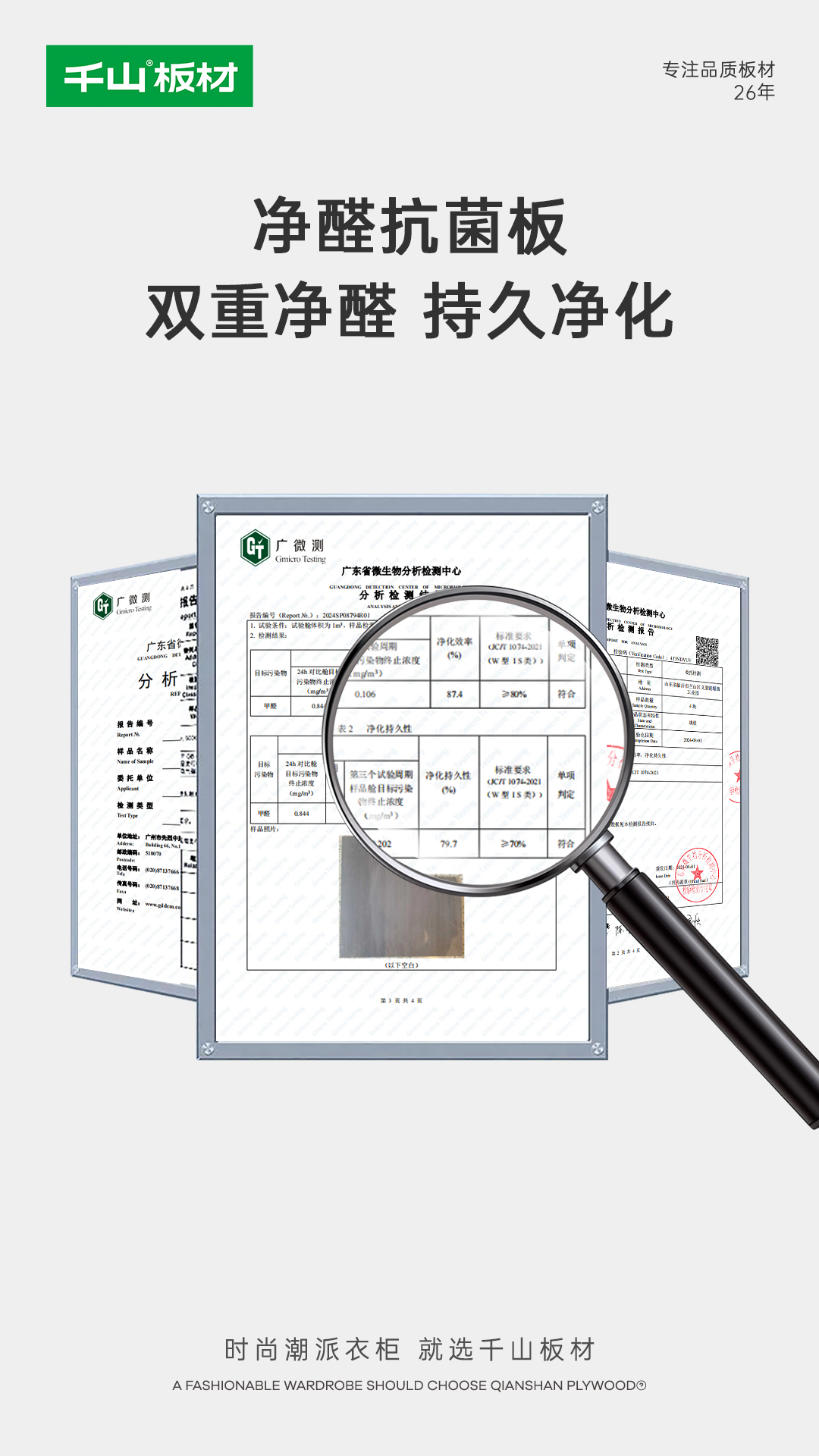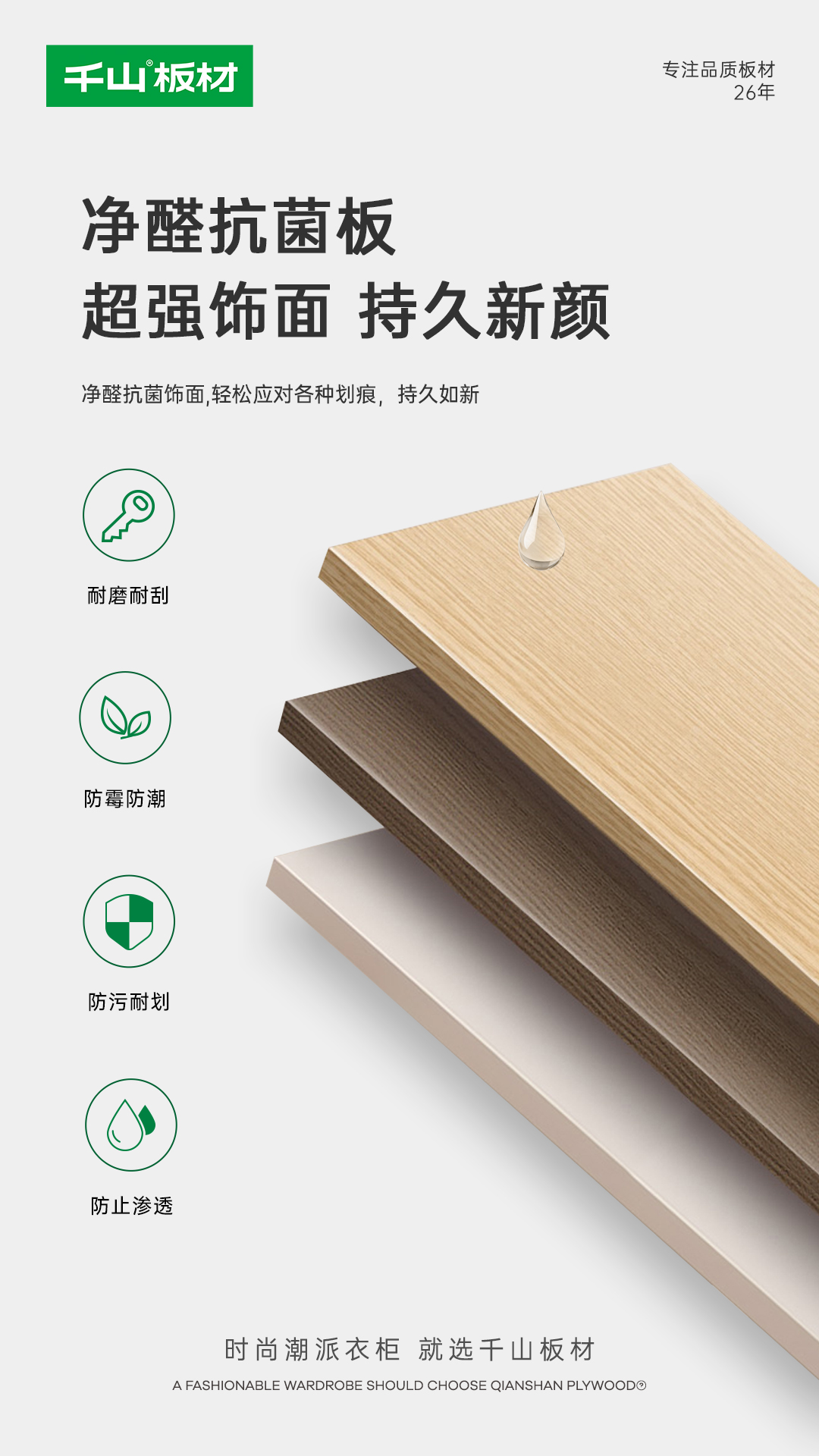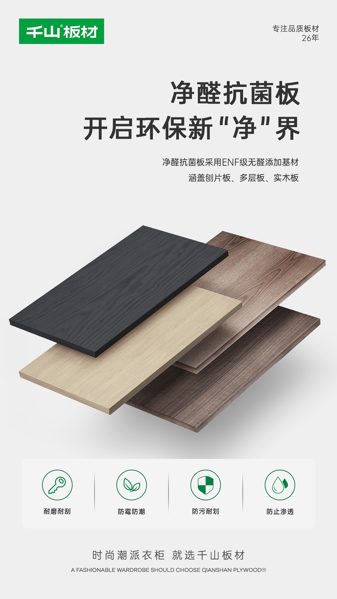 千山板材凈醛板采用ENF級(jí)無(wú)醛添加基材,涵蓋刨片板、多層板、實(shí)木板,以六大硬核優(yōu)勢(shì)強(qiáng)效發(fā)力,凈醛、抗菌、抗病毒三效合一,開(kāi)啟環(huán)保新“凈”界,從源頭打造“無(wú)醛”之家。