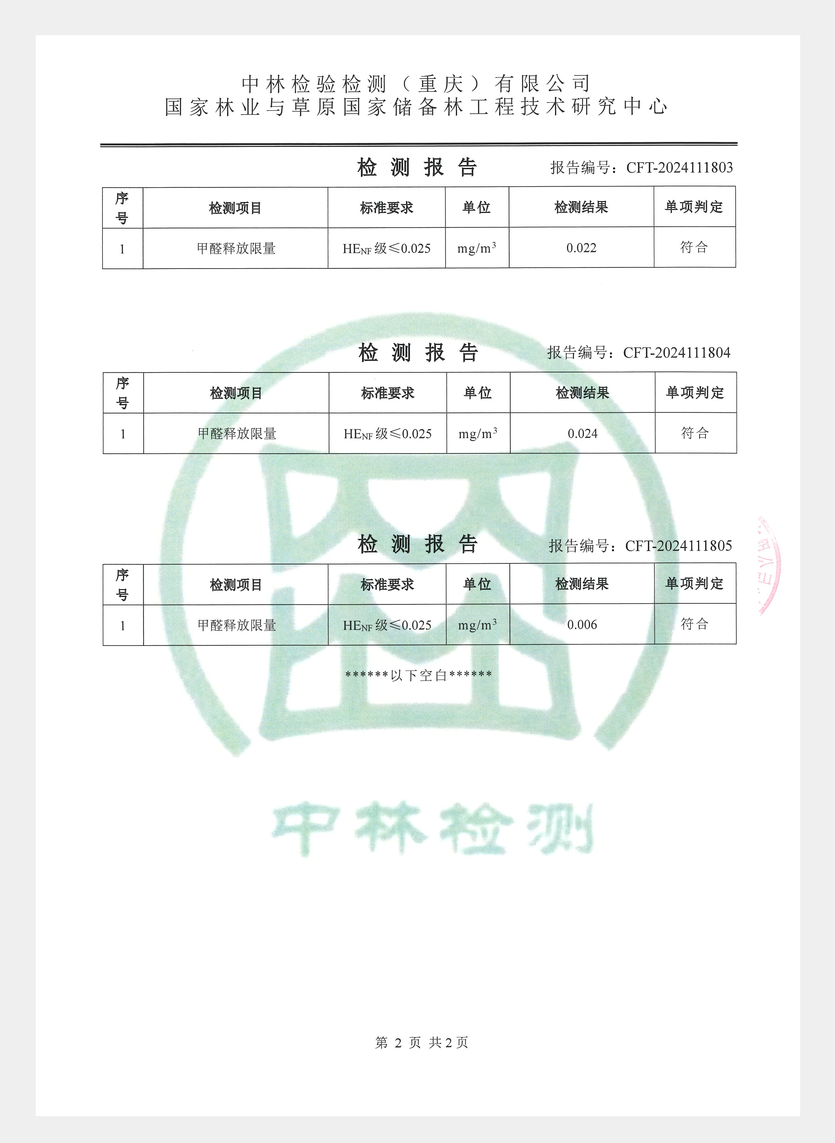 經(jīng)權(quán)威機構(gòu)檢測,千山實木大刨片甲醛釋放量為0.006mg/m3,實木多層板甲醛釋放量為0.022mg/m3,實木香杉木甲醛釋放量為0.024mg/m3,均達HEnf標(biāo)準(zhǔn)要求,同時通過ENF級和F4星雙環(huán)保檢測。