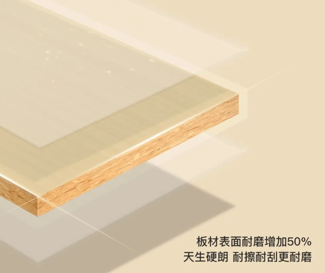 高密度離子晶體層有效分散外部壓力,吸收沖擊能量,從而顯著增強板材的垂直承載極限。20mm厚度,超出行業(yè)板材普遍厚度(18mm)10%,有效提升了板材的承重力,承重性能提升50%,輕松應對大空間儲物承壓需求。