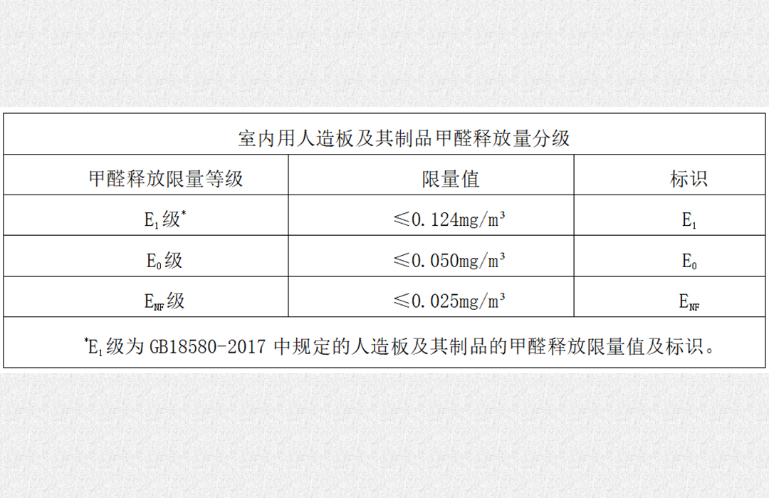 隨著人們生活水平提高,大眾環(huán)保意識(shí)逐漸增強(qiáng),為了順應(yīng)時(shí)代需要,2021年10月1日開(kāi)始,《GB/T 39600-2021 人造板及其制品甲醛釋放量分級(jí)》標(biāo)準(zhǔn)文件正式實(shí)施,即E1級(jí)≤0.124mg/m3、E0級(jí)≤0.050mg/m3和ENF級(jí)≤0.025mg/m3。